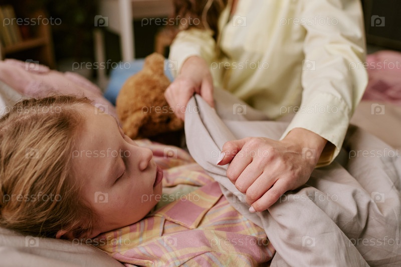 Девушка спит, пока женщина среднего возраста укладывает одеяло вокруг себя