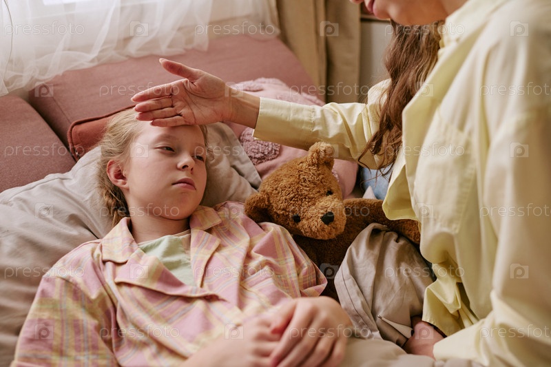 Ляжа в постели, пока женщина среднего возраста проверяет лоб девушки