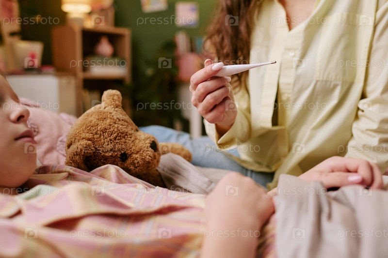 Ребенок лежит в постели, пока взрослая женщина проверяет температуру