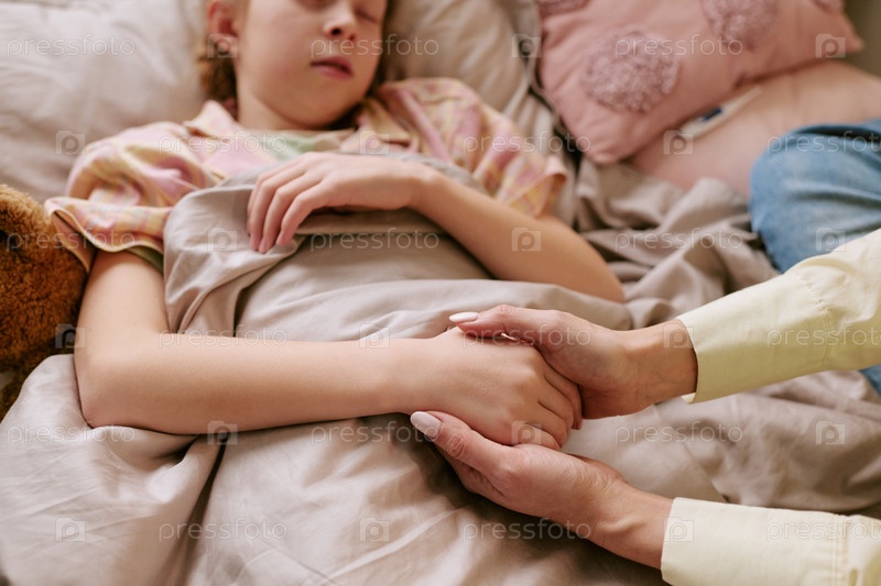 Девушка-подросток, лежащая в постели, держит взрослую женщину за руку утешительно