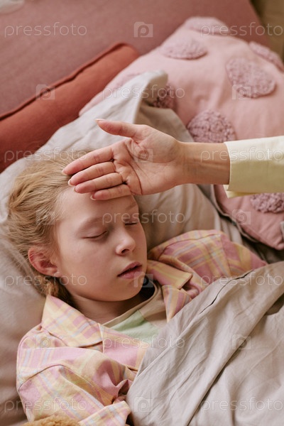 Ребенок лежит в постели, пока взрослый проверяет лоб на лихорадку