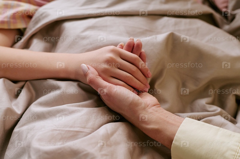 Женщина средних лет утешает ребенка, держа его за руки в постели