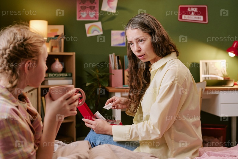 Женщина среднего возраста объясняет лекарства девочке-подростку