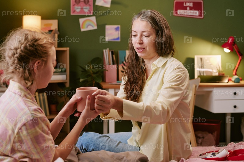 Женщина средних лет дает кружку подростковой девушке в уютной спальне