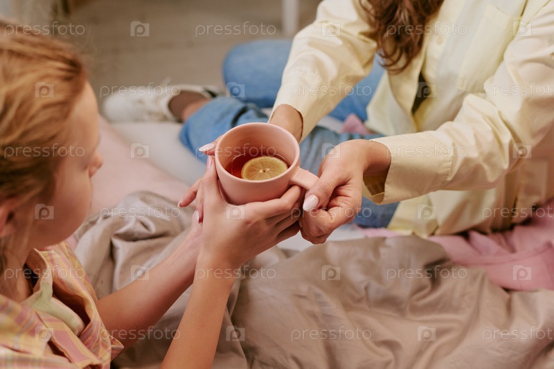 Женщина дает горячий чай с лимоном больному ребенку в постели