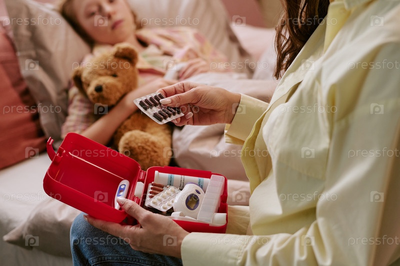 Женщина готовит лекарства для больного ребенка, отдыхающего в постели