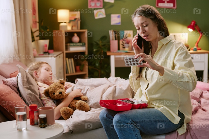 Женщина среднего возраста дает лекарства больному ребенку, лежащему в постели