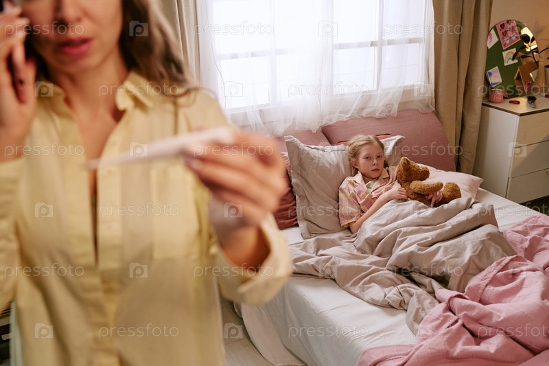 Женщина проверяет термометр во время болезни ребенка, лежащего в постели и отдыхающего