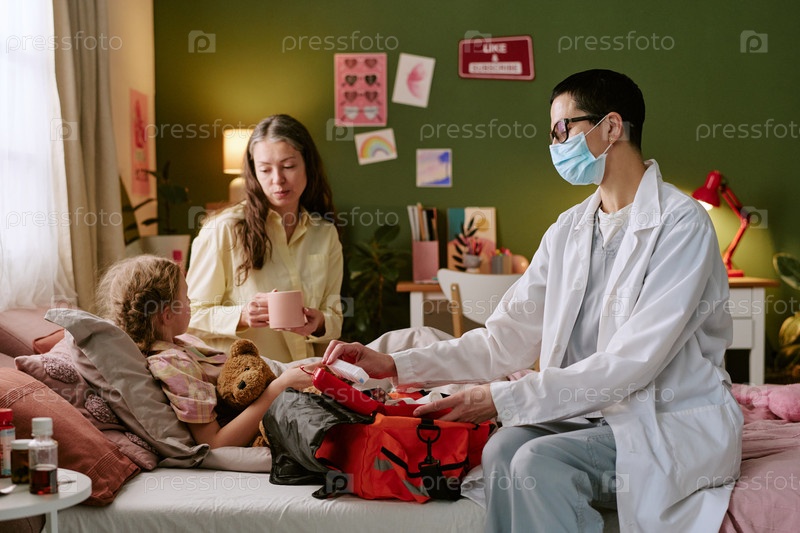 Женщина-врач, осматривающая больного ребенка с матерью в спальне