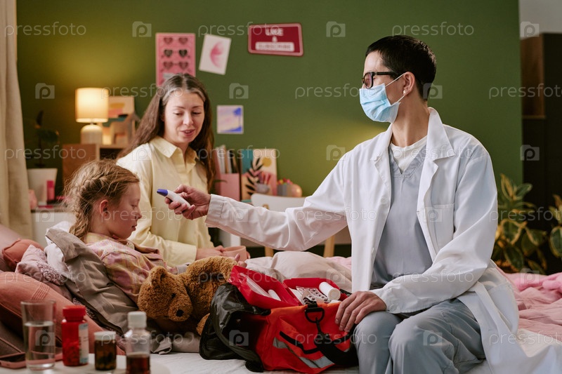 Женщина-врач, проверяющая температуру больного ребенка в спальне