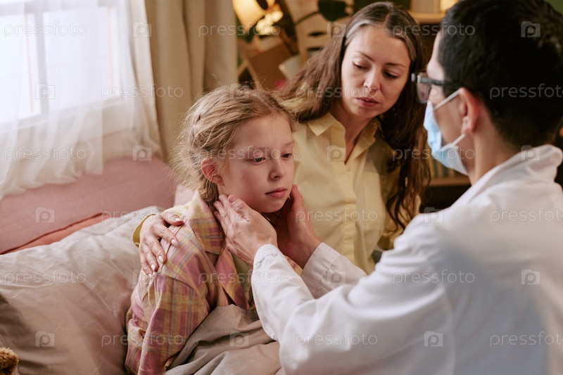Мужчина-врач осматривает девочку, в то время как мать утешает дочь