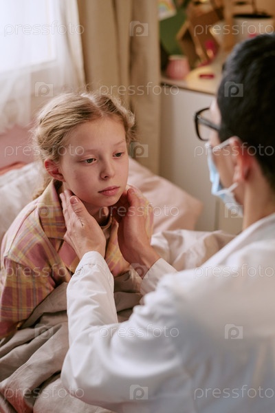 Девушка, сидящая в постели и получающая медицинское обследование от врача