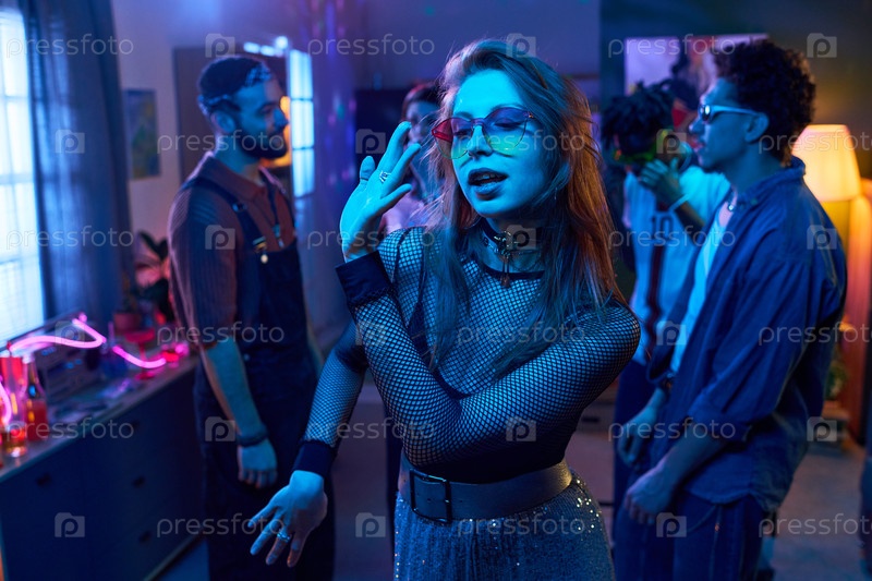 Молодая женщина танцует на вечеринке с многонациональными молодыми людьми