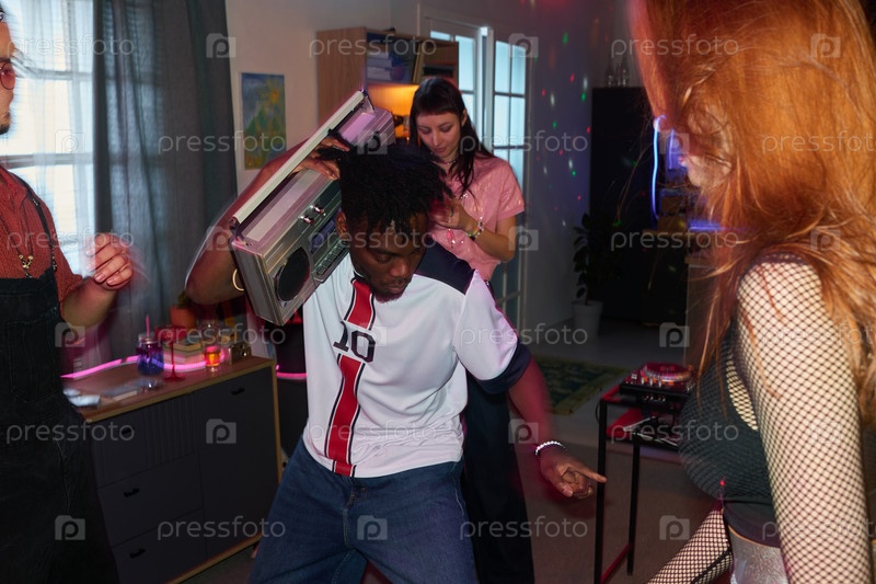Молодой чернокожий мужчина танцует с бумбоксом среди разных друзей на домашней вечеринке