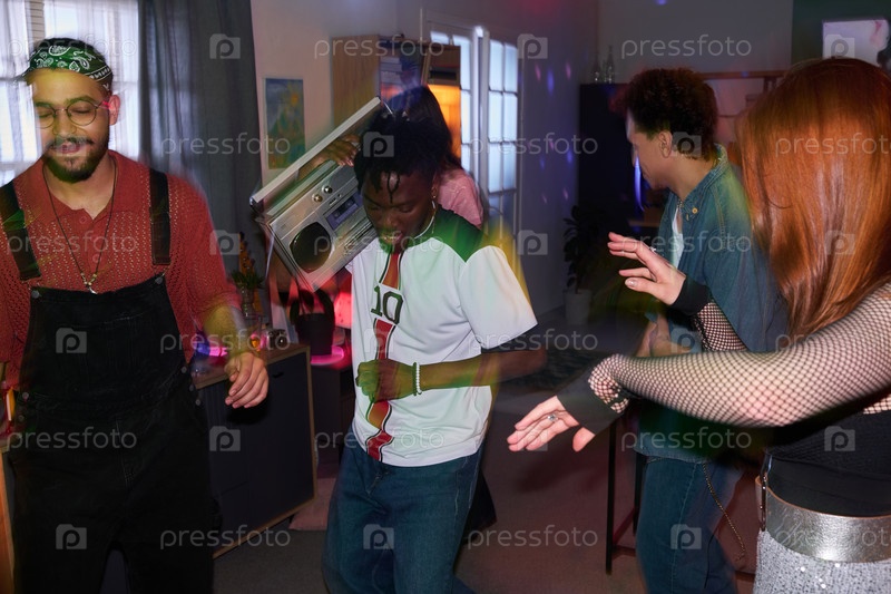 Мультиэтнические молодые люди, танцующие и наслаждающиеся домашней вечеринкой с Boombox