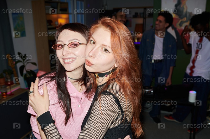 Молодые женщины обнимаются и улыбаются на вечеринке с друзьями на заднем плане