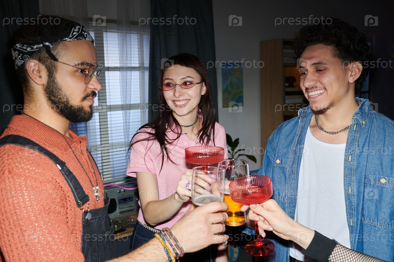 Группа молодых мультиэтнических взрослых, выпивающих напитки и улыбающихся на вечеринке