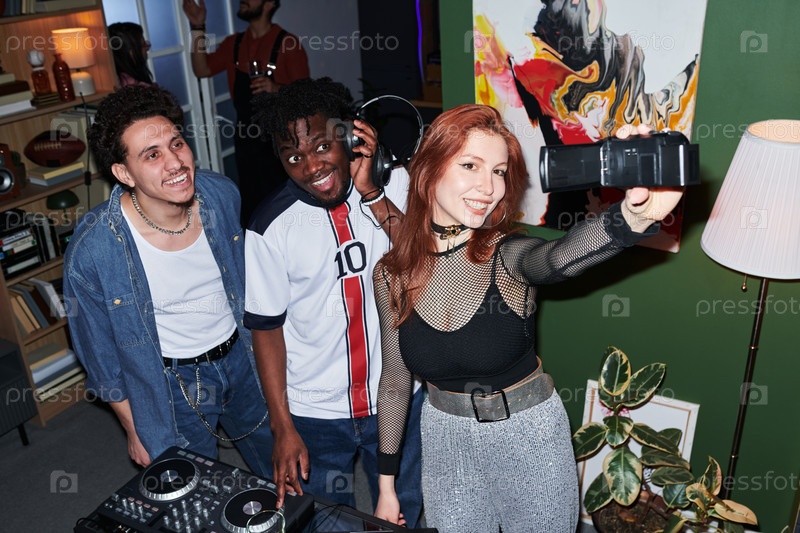 Мультиэтнические молодые люди улыбаются и делают селфи во время домашней вечеринки