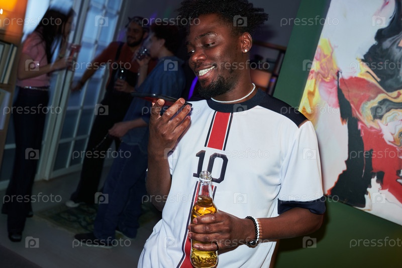 Молодой чернокожий мужчина улыбается, используя смартфон и держа бутылку пива