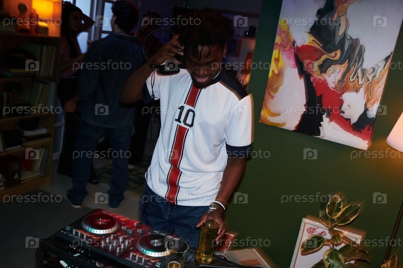 Молодой чернокожий мужчина Djing на вечеринке с друзьями, общаясь в фоне