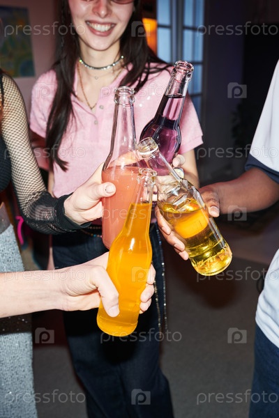 Мультиэтническая группа молодых людей, стучащих бутылки во время общественного собрания