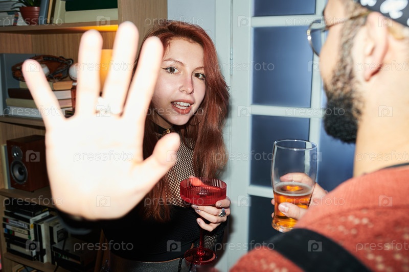 Молодая женщина жестикулирует стоп во время общения с бородатым мужчиной