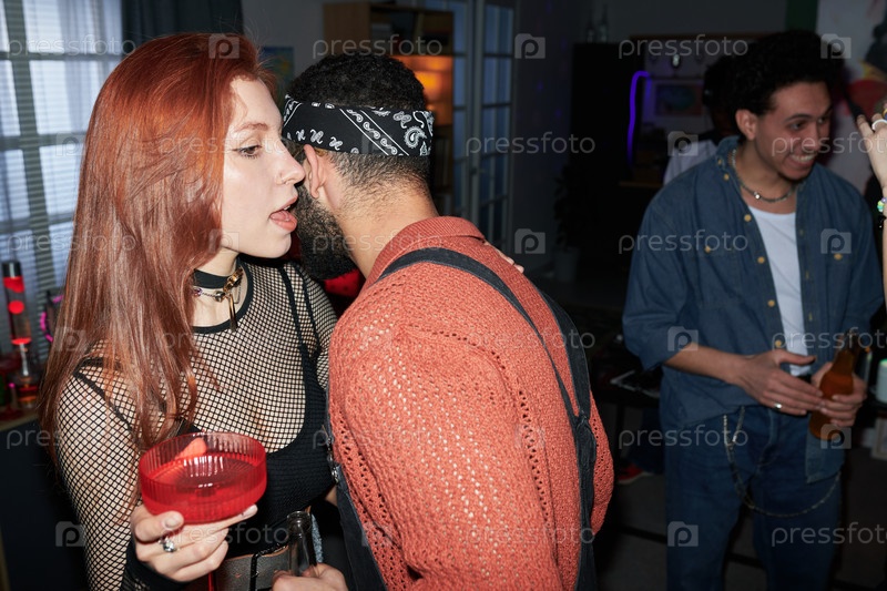 Молодая женщина шепчет молодому чернокожему мужчине на вечеринке в доме