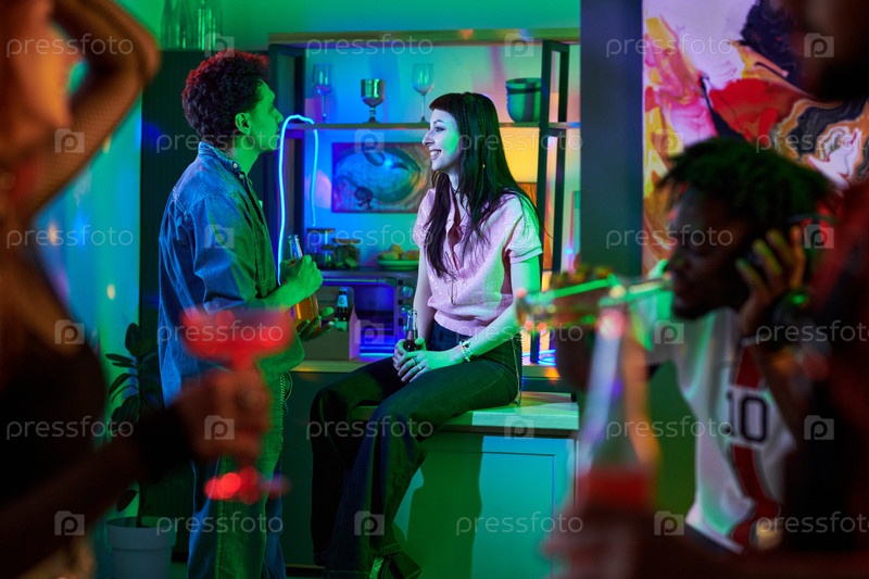 Мультиэтнические молодые люди общаются и пьют на вечеринке в доме