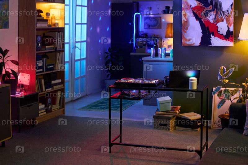 Современная гостиная с диджейским контроллером и ноутбуком на столе ночью