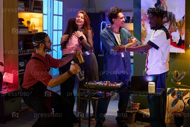 Группа многонациональных молодых людей, общающихся и танцующих на вечеринке в доме