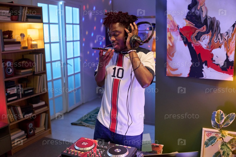 Молодой чернокожий мужчина смешивает музыку и говорит в микрофон смартфона
