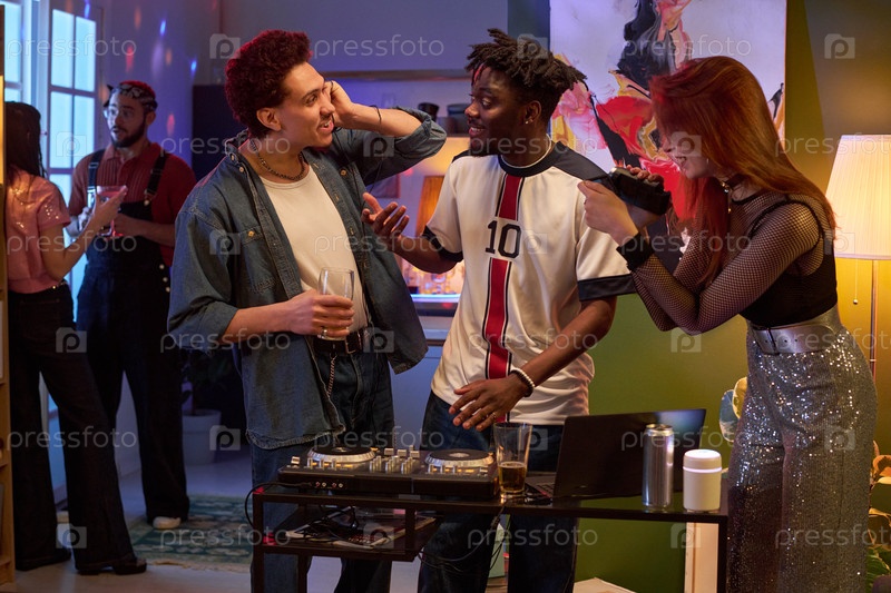Группа молодых друзей, общаясь и смеясь на домашней вечеринке