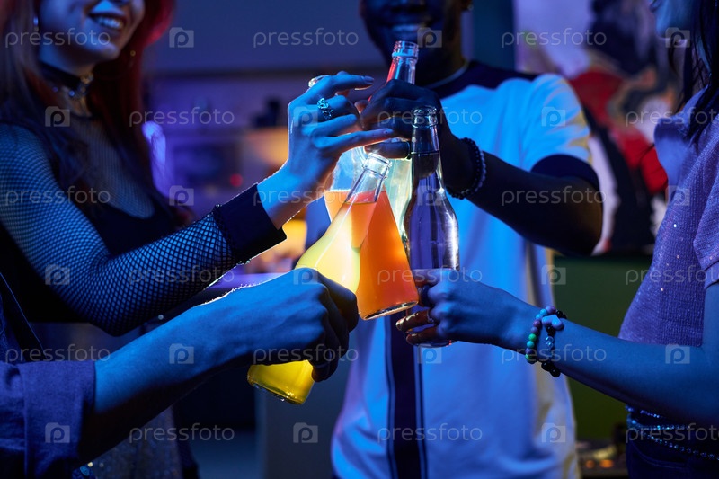 Мультиэтническая группа молодых людей, выпивающих бутылки во время празднования ночной вечеринки