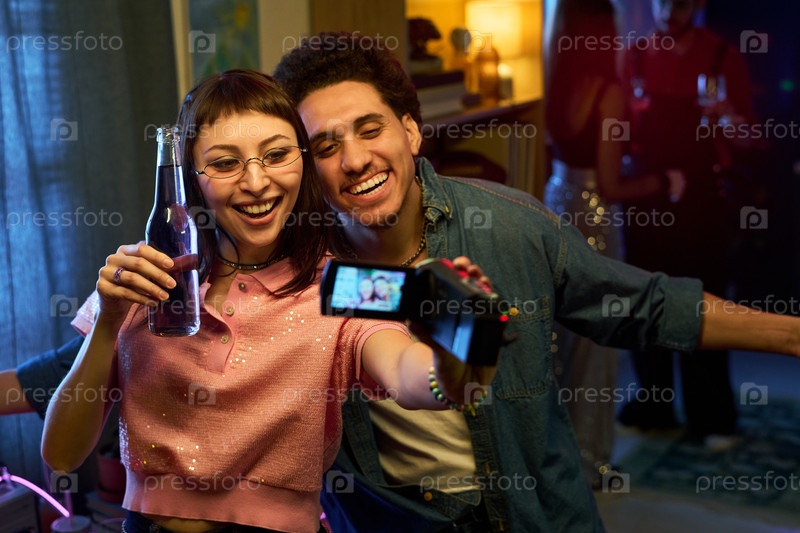 Молодые мультиэтнические друзья записывают видео селфи и улыбаются на домашней вечеринке
