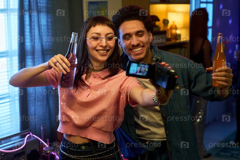 Молодая женщина и молодой мужчина записывают видео во время празднования вечеринки