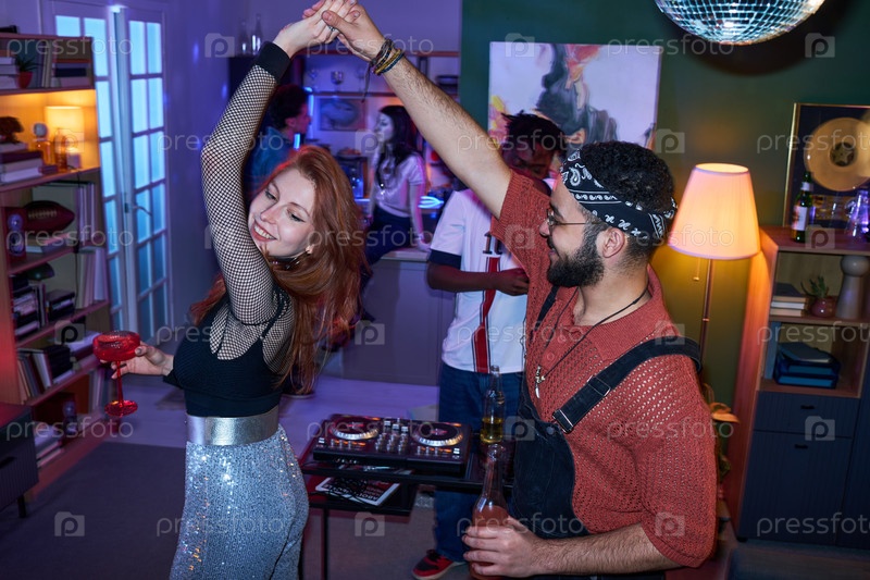 Молодая женщина танцует с молодым мужчиной из Ближнего Востока на домашней вечеринке