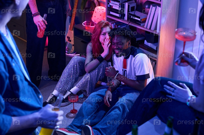 Молодая женщина шепчет молодому чернокожему мужчине во время собрания домашней вечеринки