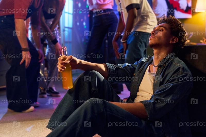 Молодой чернокожий мужчина сидит один, пьет напитки на вечеринке