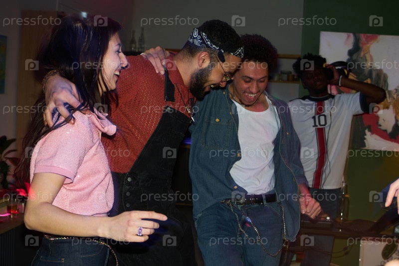 Группа молодых мультиэтнических друзей, танцующих вместе на вечеринке в доме