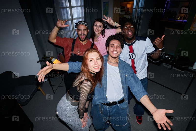 Группа молодых мультиэтнических друзей, играющих и улыбающихся перед камерой