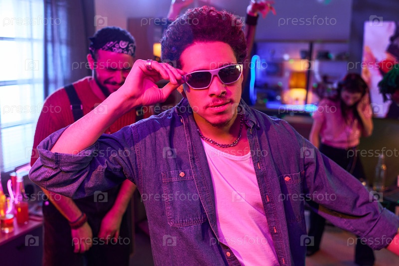 Молодой испаноязычный мужчина с солнцезащитными очками танцует на домашней вечеринке в помещении