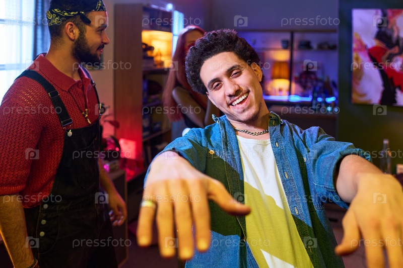 Молодой человек улыбается и танцует на домашней вечеринке с друзьями