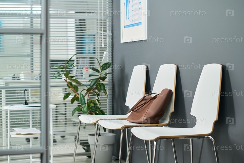Пустая комната ожидания показывает современные стулья и сумку, отдыхающую на сиденье