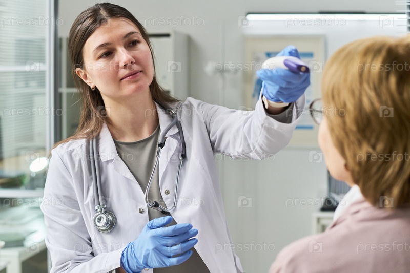 Женщина-врач, измеряющая температуру молодой старшей женщины