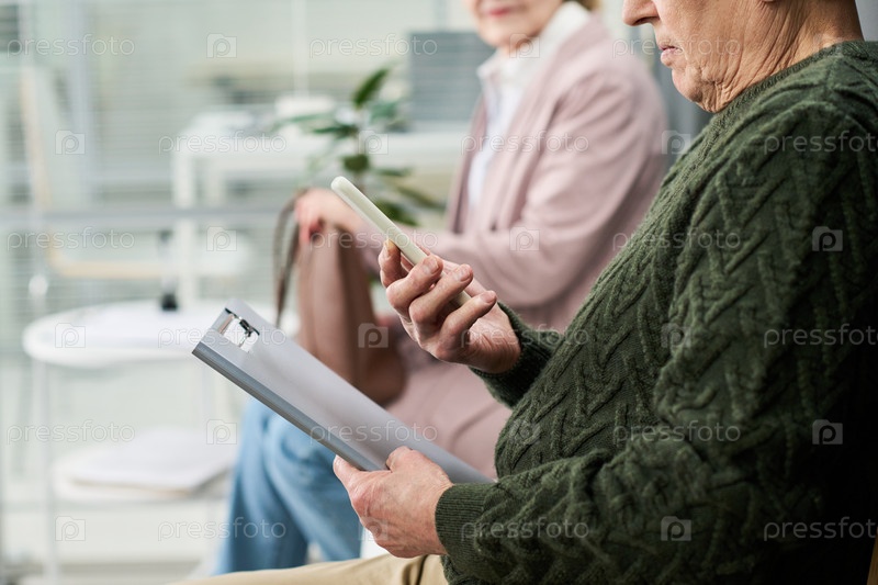 Пожилой мужчина использует смартфон во время ожидания в медицинском кабинете