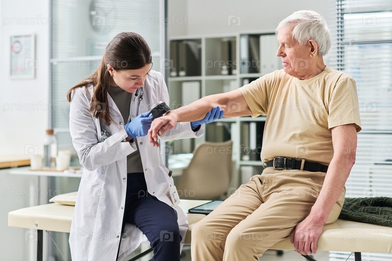 Женщина-врач, выполняющая проверку кожи на старшем мужчине Young Arm