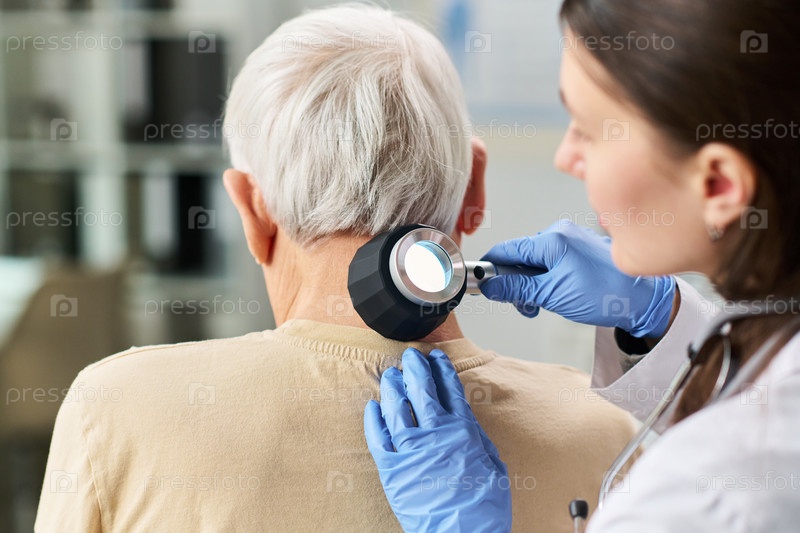 Мужчина, проходящий осмотр кожи женщиной-врачом в клинике
