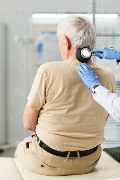 Старший мужчина проходит осмотр кожи у медицинского работника