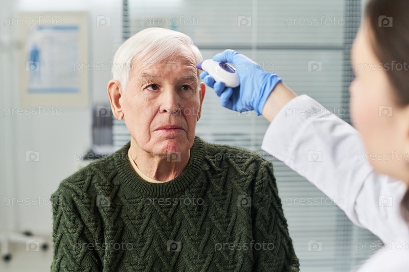 Старший мужчина проходит проверку температуры женщиной-врачом