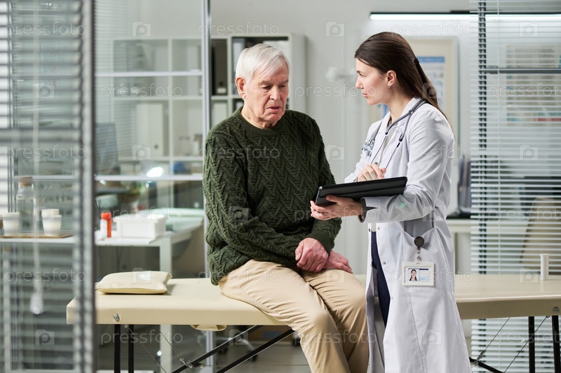 Старший мужчина слушает женщину-врача, которая просматривает медицинский график в клинике